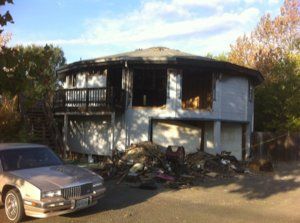 The yurt that caught on fire inside. When the flames burned the pine boards on the ceiling; first the bubble blew off from the heat then the fire burned the pine ceiling and heated up the fasteners until the paper backing and the fireproof cellulose insulation above, along with the burning pine boards, all fell to the floor and the cellulose on top extinguishes the flames leaving the roof structural framing untouched by the fire.
