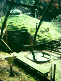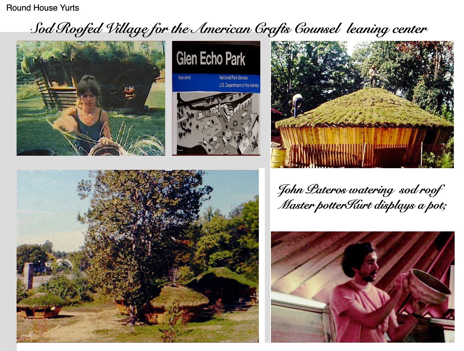 We are presently building a sod roof cluster on a hillside above Ukiah with a roof to roof transition stair and perimeter roof railing, as well as a floating deck floor, hang out area on the roof interconnect. We have been building sod roof systems in the United States for over 3 decades. Our oldest still in use is the sod roof solar village at Glen Echo Park in Washington D.C. I built this village back in 1972 for the American Crafts Council in our national park. We now incorporate the latest floating roof liner technologies and perimeter roof edge gutters/railings as well as automatic drip systems to keep your roof green. This roof is more expensive than our 50 tear elk fireproof shingle roof systems. Below right Pottery Sod yurt is 35 years old.