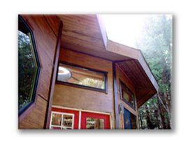 Hopland green subdivision built in 1986 below left with earth-friendly materials and recycled newspaper fireproof roof insulation and fireproof ceramic finished O.S.B. from row cropped Aspen with resin glues as siding and sheathing with bamboo floors and old wine tank 2x trim. Across the street from the Real Goods Solar Living Center. - David Raitt